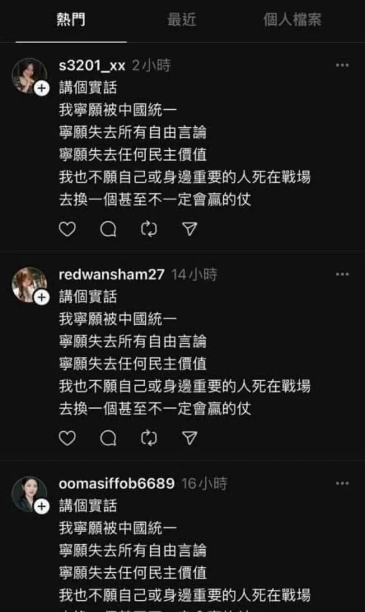 - 11-27 13:15 ckhung0 已經 剛剛狂發私訊,提供兩個影片連結。 如果知道是反共的親友,就補一句「可以給藍白親友看」; 如果對方是藍白或者我不確定,就補一句「拜託一定要看完 orz」。 焦慮煩燥沒有幫助; 戰爭發生之前, 我能盡量做的, 就是用適當的資訊反擊 #認知戰 。 如果這兩部影片會讓哪一位朋友跟我絕交.. 那我一點都不介意喔!
